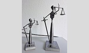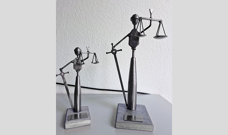 Das Amtsgericht hatte dieses Jahr die Woche der Justiz ausgerufen, um über die Arbeit im Gericht zu informieren und Werbung für berufliche Möglichkeiten zu machen und dazu die Justitia Challenge ins Leben gerufen. Und die beiden Gemeinschaftskundekurse von Frau Zund-Grodzki und Frau Braun hatten Lust und stürzten sich motiviert auf die lange Liste von Fragen, Rechtsgrundlagen, Fällen und Dilemmatasituationen. Arbeitsteilig und mit ChatGPT als Unterstützung wurden alle Aufgaben gelöst und sogar ein Logo fürs Amtsgericht entworfen. Und beide Kurse kamen ins Finale und traten am 26.6.2025 im Amtsgericht gegeneinander an. Es ging um nichts mehr als zwei Justitiastatuen – groß und klein - handgefertigt von der Metallverarbeitung aus den Sozialmaßnahmen der JVA. Die Schülerinnen und Schüler und auch die beiden Kolleginnen waren vorher etwas nervös – würden wir uns gleich mit unserem (Nicht)Wissen blamieren? Würde es langweilig werden, nochmal 100 Fragen zu Rechtsausbildung beantworten zu müssen?!