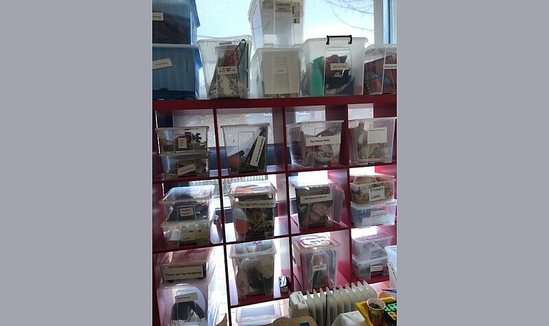 Hier ist die große Auswahl an “sensory stories” zu sehen. Diese enthalten Medien, die die unterschiedlichen Sinne ansprechen, wie Duftöle, Bilder und Federn, die thematisch zu der jeweiligen Geschichte passen. In der Schule werden diese Geschichten vorgestellt, wobei an den passenden Stellen die entsprechenden Gegenstände herumgegeben oder die Schüler damit berührt werden.