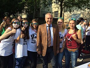 Auch viele Lehrer konnten nicht umhin, bei der kleinen Feierei im Hof vorbeizuschauen. So wurden gemeinsame Fotos gemacht, geplaudert und gelacht.