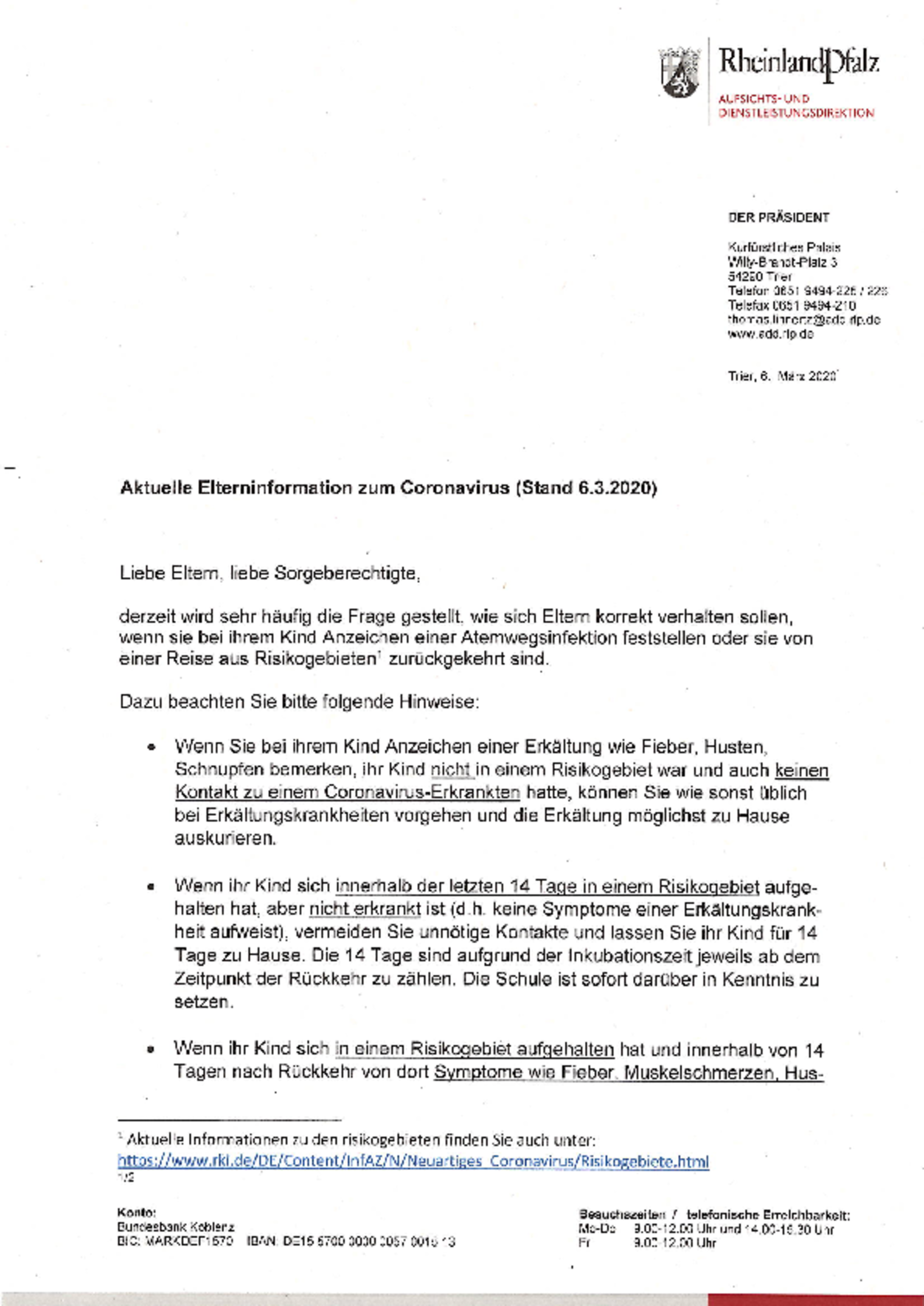 Aktuelle Elterninformationen zum Coronavirus (Stand 06.03.2020)