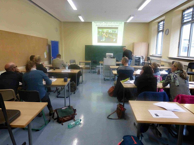 Im Anschluss daran wurden Gesprächstechniken und -leitfäden vorgestellt und in Rollenspielen erprobt (sog. „Psychospiel-Memory“), um betreffende Schülerinnen und Schüler in Bezug auf ihre jeweiligen aktuellen Problemkonstellationen in einem Vier-Augen-Gespräch zu unterstützen.