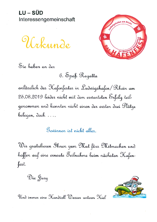 Die Lehrkräfte Paul Lungan-Horst und Jakob Sonne hatten für die Spaßregatta in diesem Jahr ein schwimmendes Klassenzimmer gebaut, welches allen feindlichen Attacken der anderen Teams erfolgreich standhielt und bei der Siegerehrung mit einem Gutschein für eine Prunksitzungskarte des KV Rheinschanze 1877 e.V. und der verdienten Urkunde der Interessengemeinschaft LU-SÜD ausgezeichnet wurde.