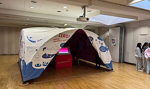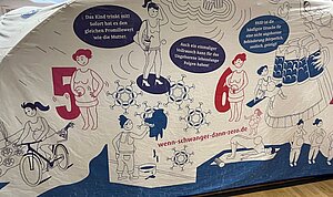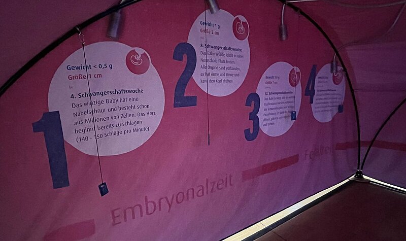 Eine besonders eindrucksvolle Station stellte eine begehbare Gebärmutter dar. In dieser Installation wurde die Entwicklung eines ungeborenen Kindes über die zehn Monate der Schwangerschaft anschaulich und grafisch visualisiert. Die Lernenden konnten nachvollziehen, welche Entwicklungsschritte der Embryo in den einzelnen Monaten durchläuft. Ergänzt wurde die Darstellung durch originale Aufnahmen ungeborener Babys, die einen authentischen und bewegenden Einblick in die pränatale Entwicklung ermöglichten.
